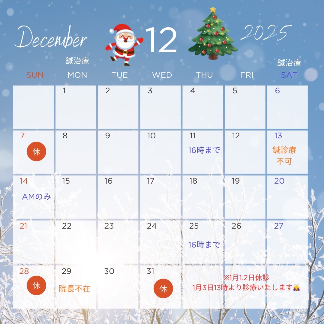2025年12月28日(日)〜2026年1月3日(土)の診療予定は下記のとおりです。